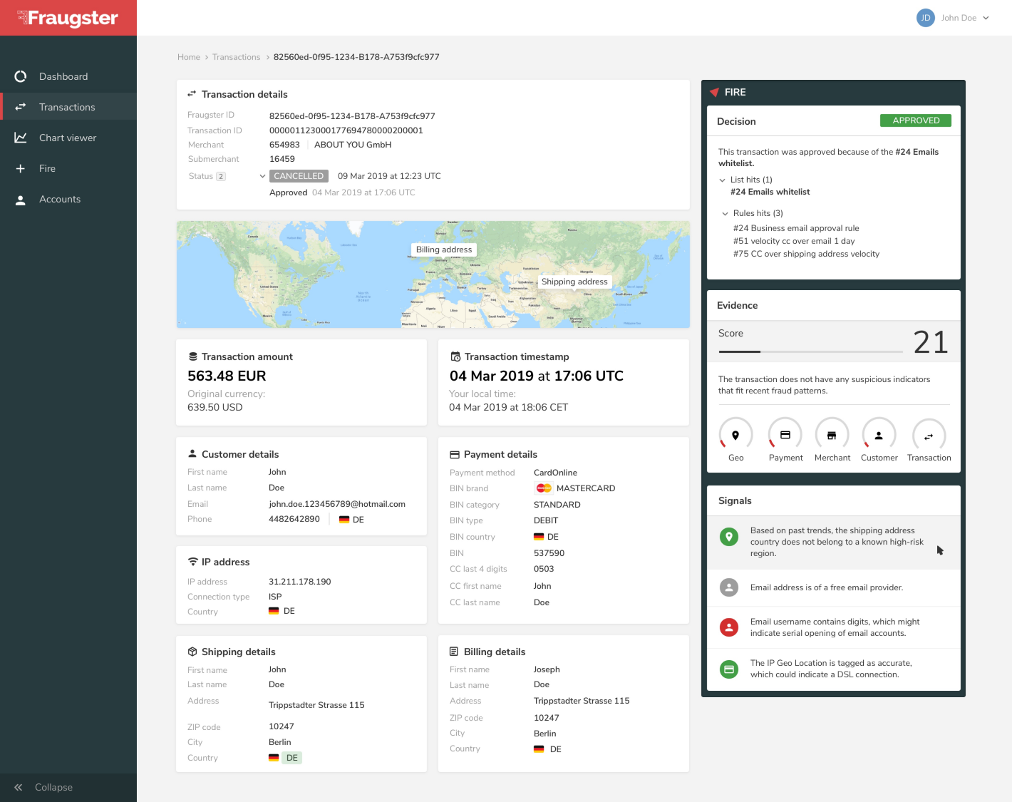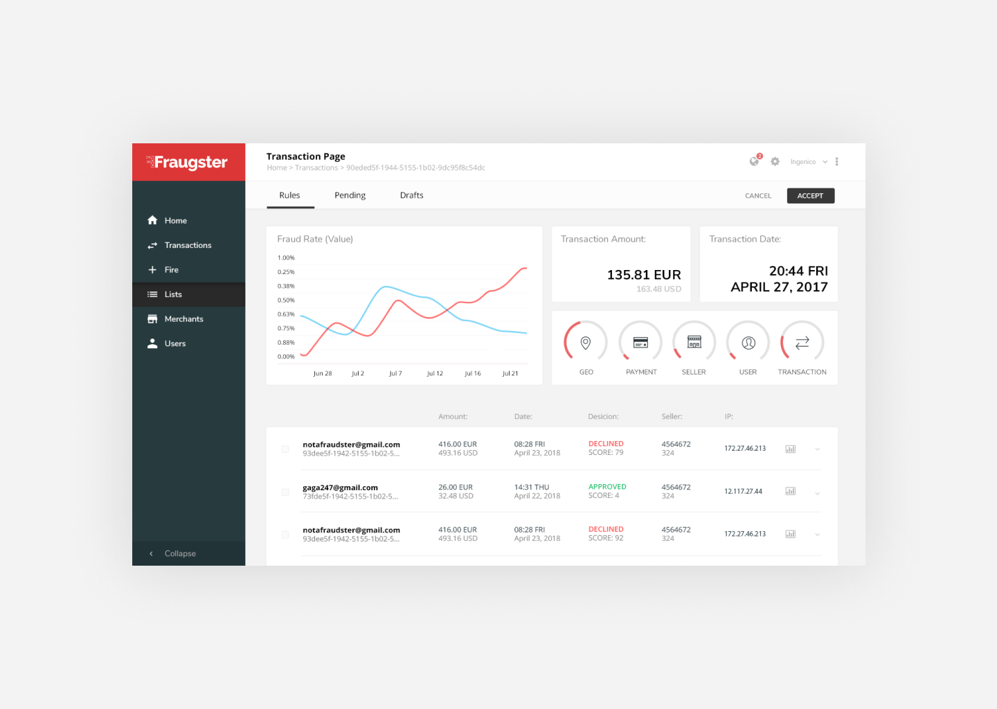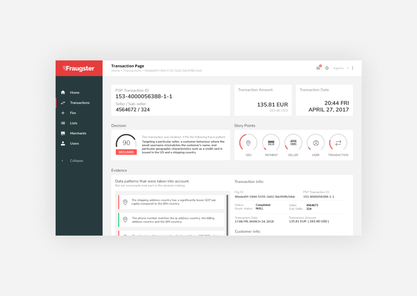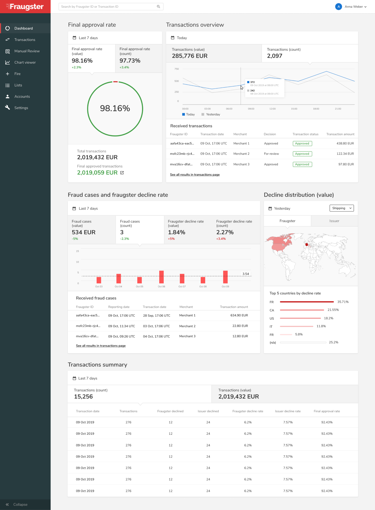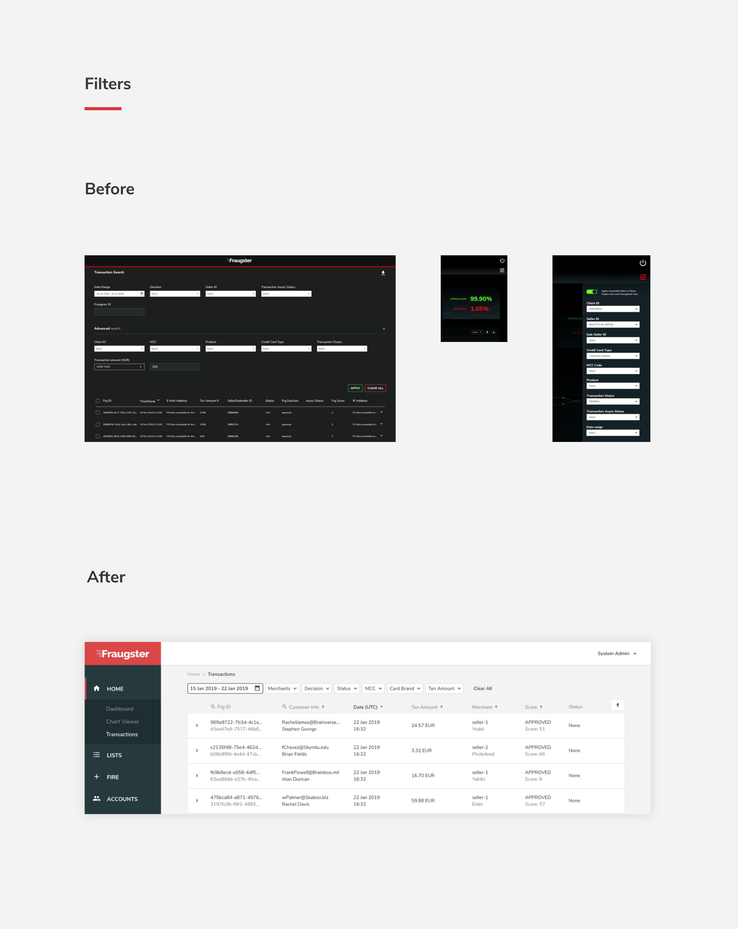 Looking forward a year after the redesign. We managed to develop more than 10 new sections in our platform, including a new dashboard, new transaction page and a rule manager. All built to give the users the right tools to manage risk and catch fraud. Here are some examples of the new pages that we developed: