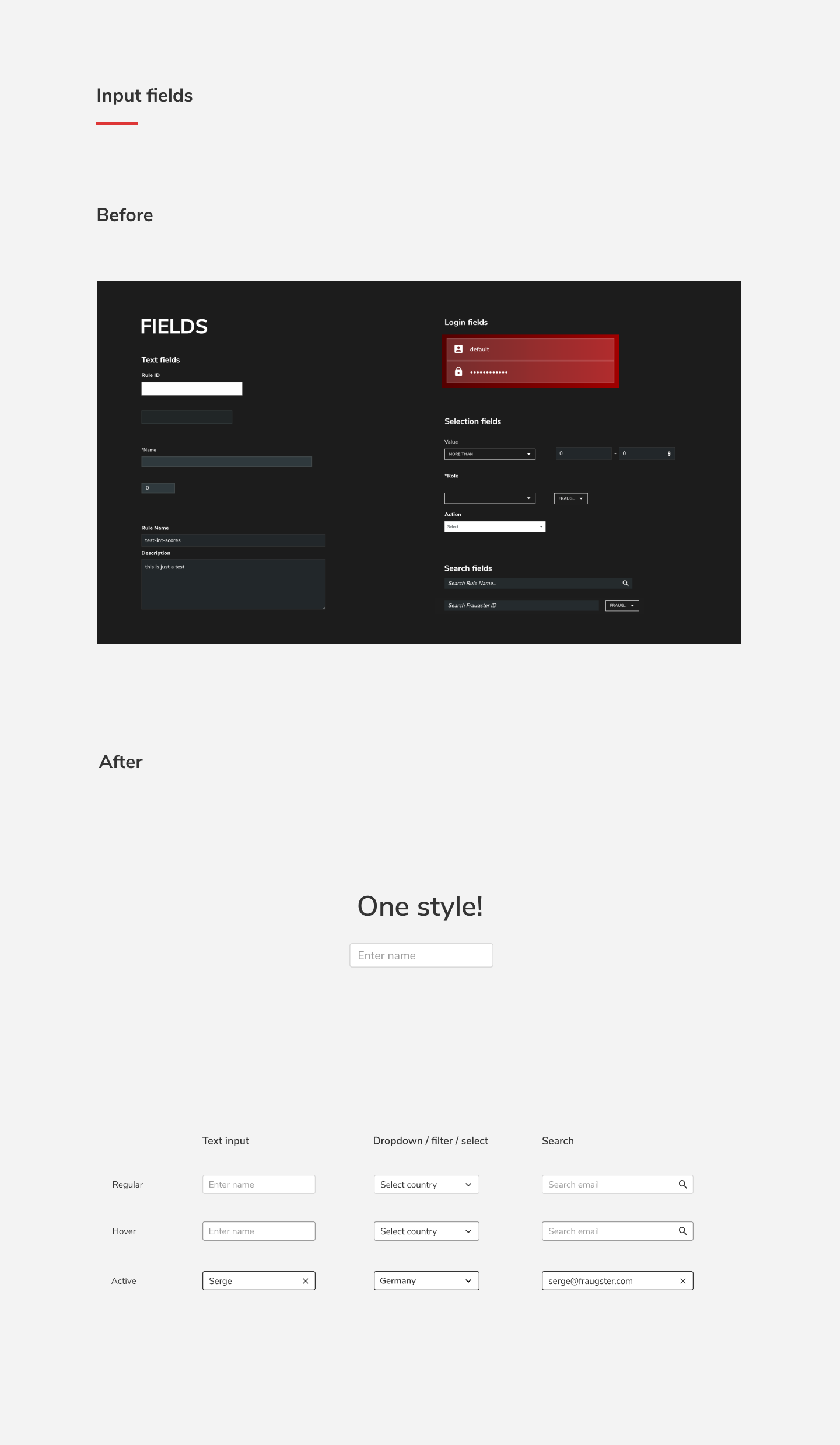 First, I did indexing of all our components, grouped them and listed all our UI faults. Then I started researching the UI side, how our competitors look like, what style will fit us best, and